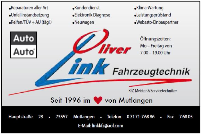 Oliver Link Fahrzeugtechnik Hauptstr. 28 73557 Mutlangen Tel. 07171 76886 Fax 07171 76805 Email linkkfz@aol.com Ansprechpartner: Oliver Link |